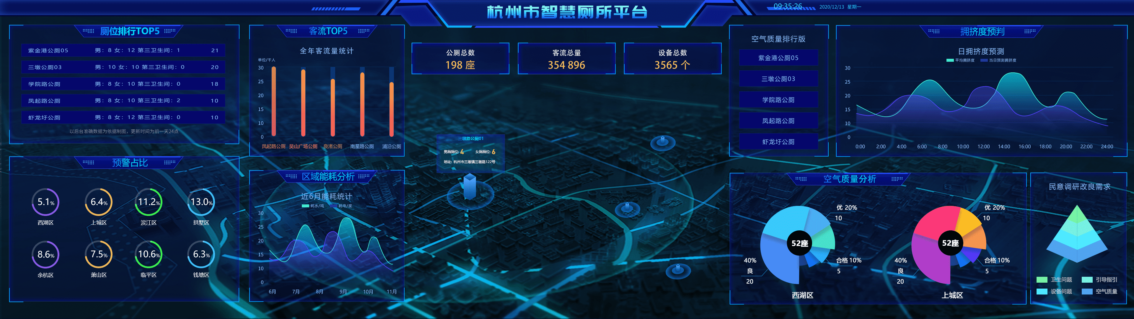 建立全区域的智慧公厕运行平台,建成以“智慧公厕”运行数据为基础的可视化研判一张图。通过挖掘业务数据,实现区域公厕建设结果的数据研判,动态监管,辅助监管决策。